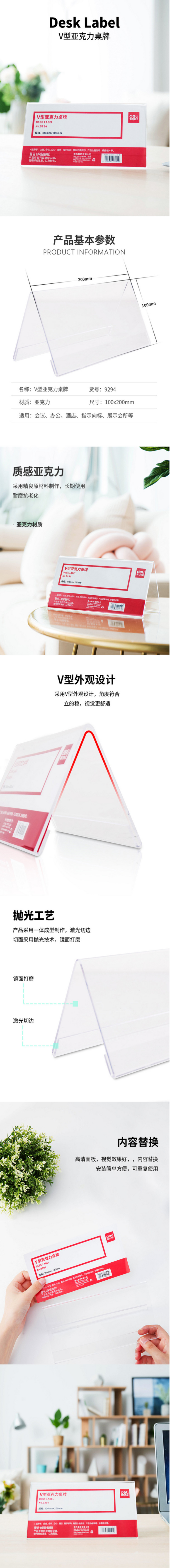 商品名称:得力(deli)9294 亚克力V型桌牌 双面标牌三角桌牌会议牌桌签 200*100mm 单只 透明