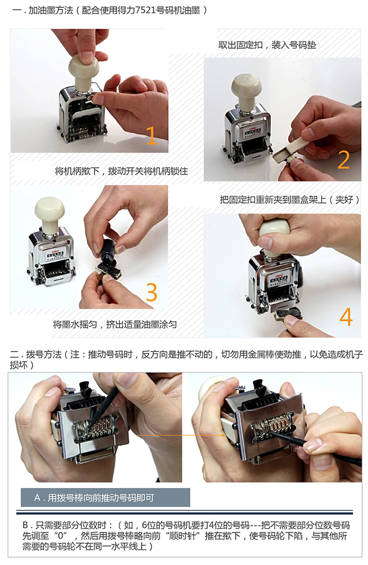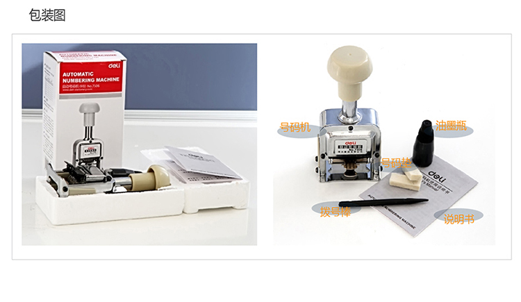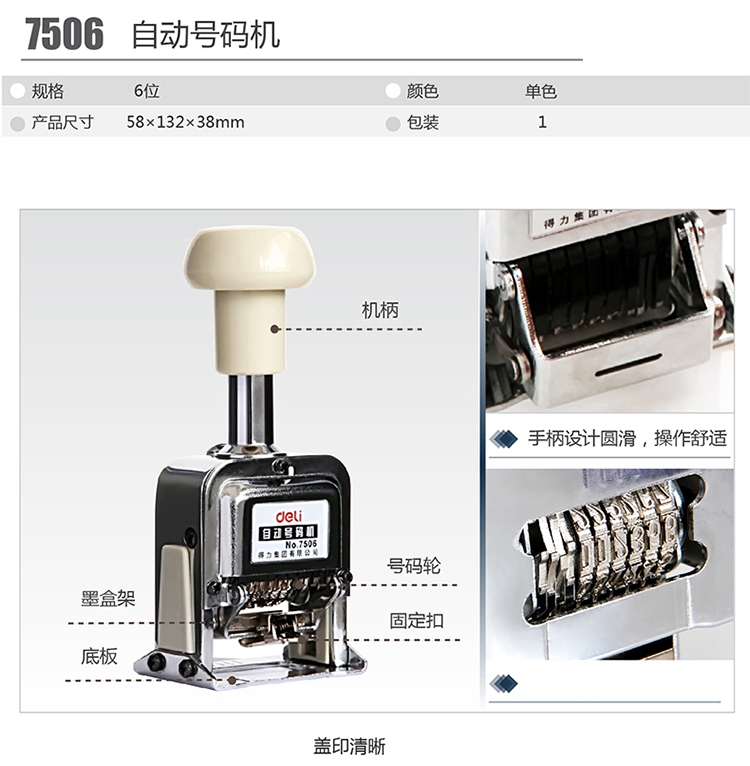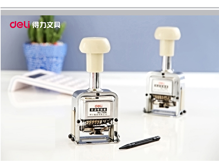 商品名称:得力(deli)7506 自动号码机手动打码机编号打号器页码机6位日期可调数字印章 单个 银色