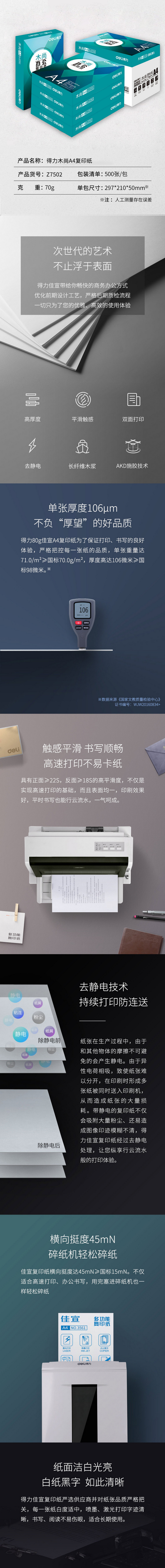商品名称:得力(deli)Z7502 木尚 复印纸 A4 70g 500张/包 5包装 白色 一年质保