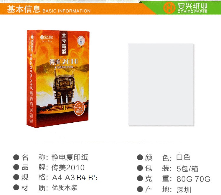 商品名称:传美2010 B4 80G 复印纸 500张/包 单包装