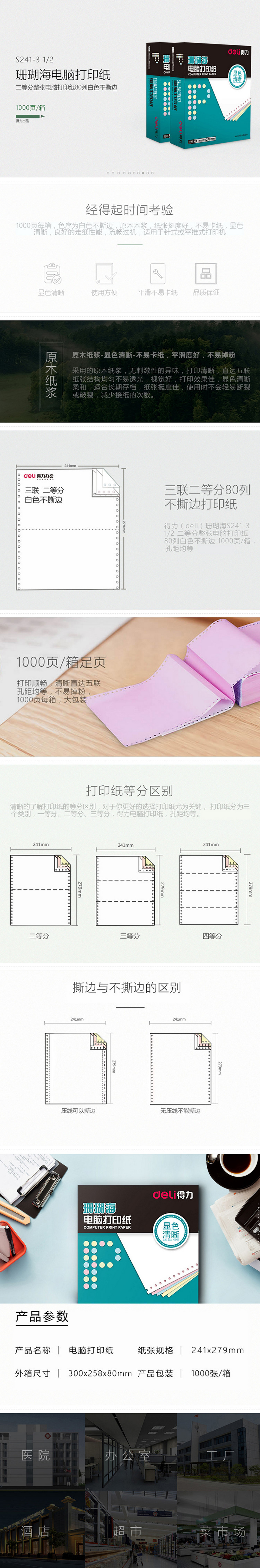 商品名称:得力(deli)S241-3-1/2 电脑打印纸 白色针式打印纸 三联二等分不撕边 80列 1000页/箱 整箱价