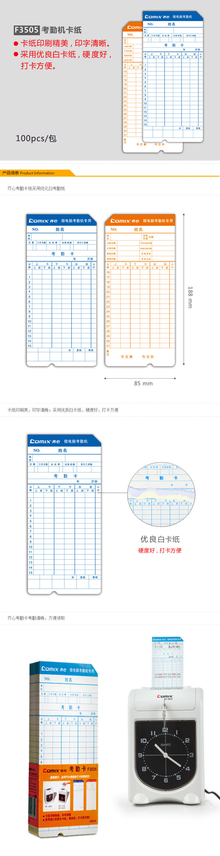 商品名称:齐心(COMIX)F3505 100张/包 300g优质双面考勤卡纸/打卡纸/卡钟卡纸