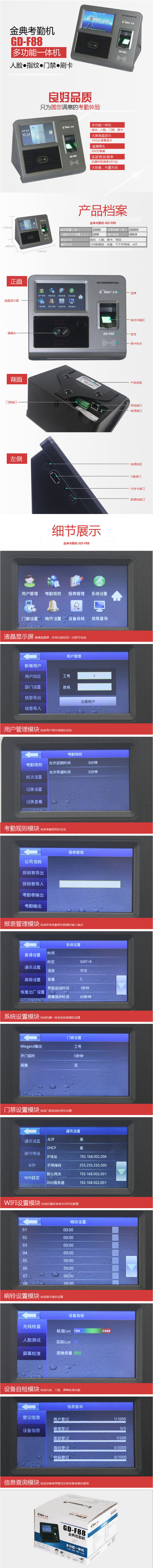 商品名称:金典(GOLDEN)GD-F88 考勤机 指纹人脸门禁一体打卡机 异地远程签到 单机版 黑色