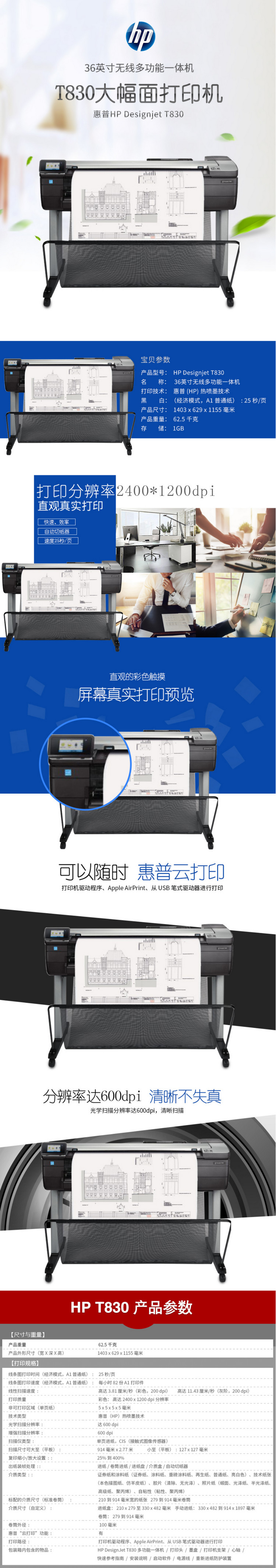 商品名称:惠普(HP)T830 A1-24英寸彩色大幅面多功能一体机