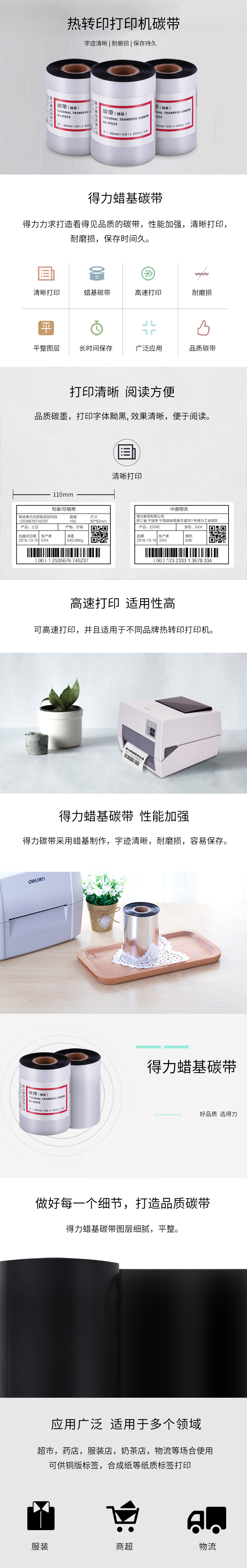 商品名称:得力(deli)81523 热转印条码标签机蜡基碳带 90mm*300m 36卷/箱