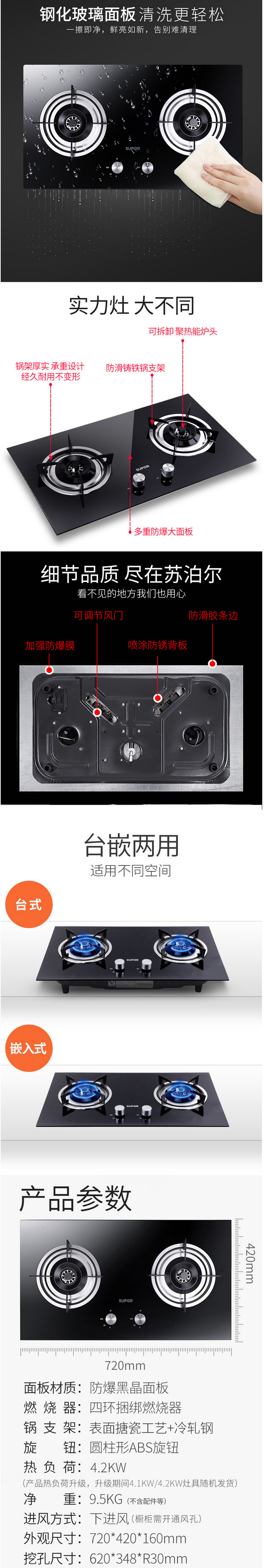 商品名称:苏泊尔(SUPOR)QB503 天然气炉灶 双灶 家用嵌入式 额定热负荷4200W 黑色不锈钢色备注