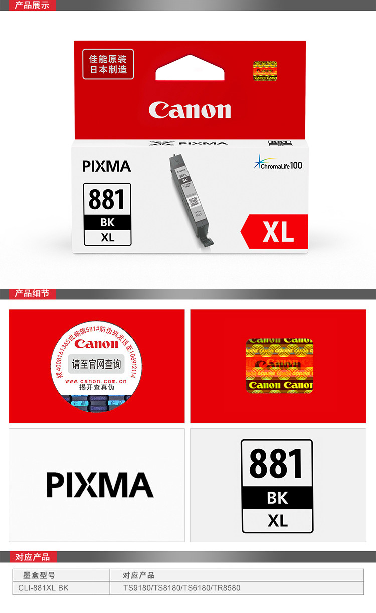 商品名称:佳能(Canon)CLI-881XL BK 黑色墨盒 11.7ML 适用机型:TS9180/TS8180/TS6180/TR8580 单支装