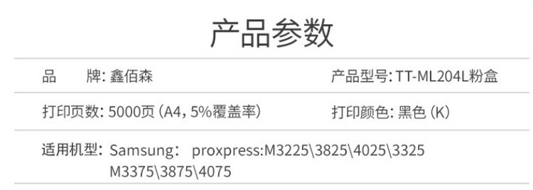 商品名称:鑫佰森 TT-ML204L 黑色粉盒 NT-CS204CS 适用三星 M3375 M3325 M3825 M3825 打印机 单支装